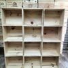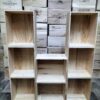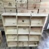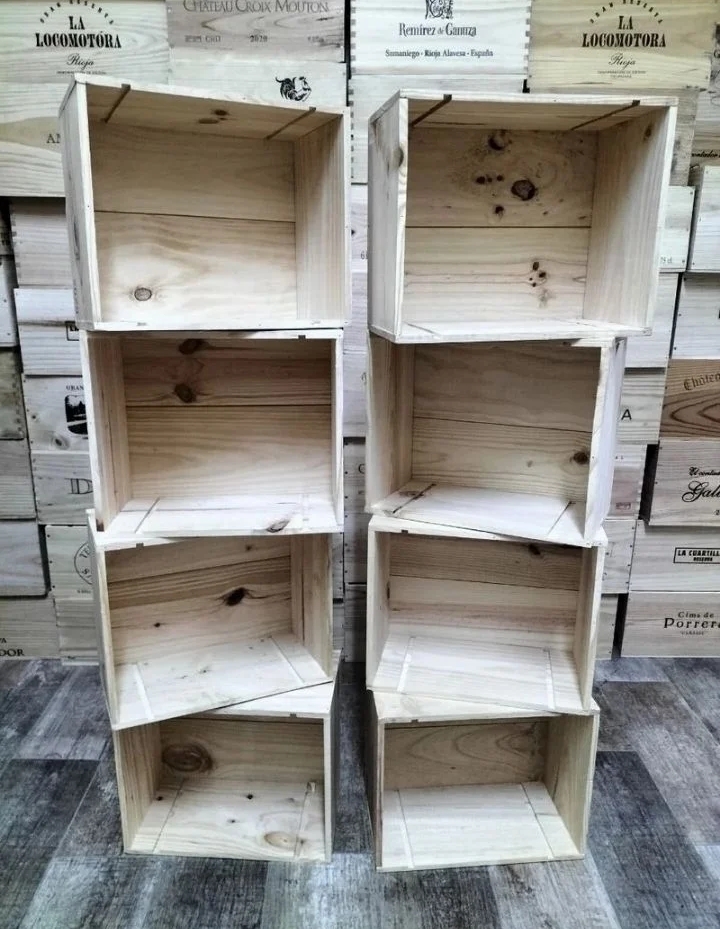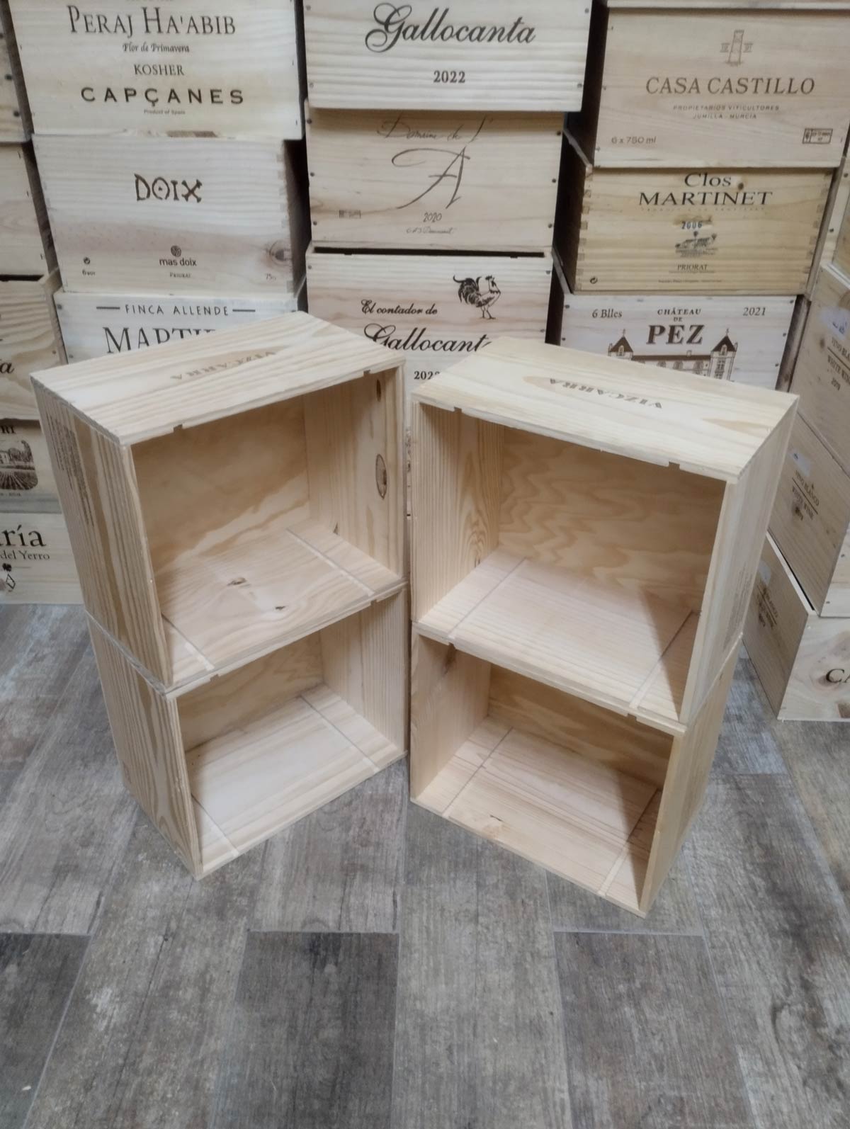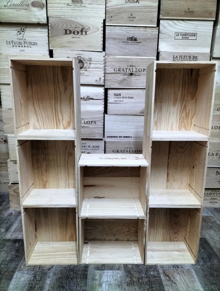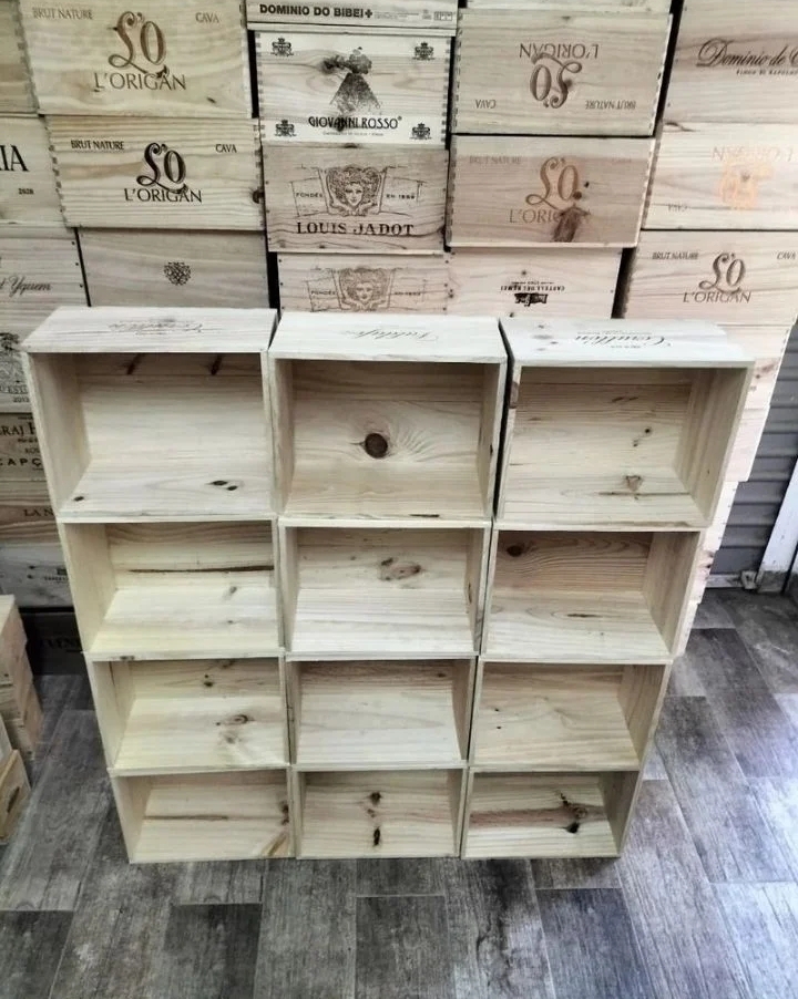 Lote de 12 cajas de vino de madera perfectas para creación de estanterías o cajoneras. Este lote se caracteriza en que todas las cajas son iguales de tamaño y llevan muy poco detalle decorativo puesto que su finalidad es la practicidad, no la decoración.