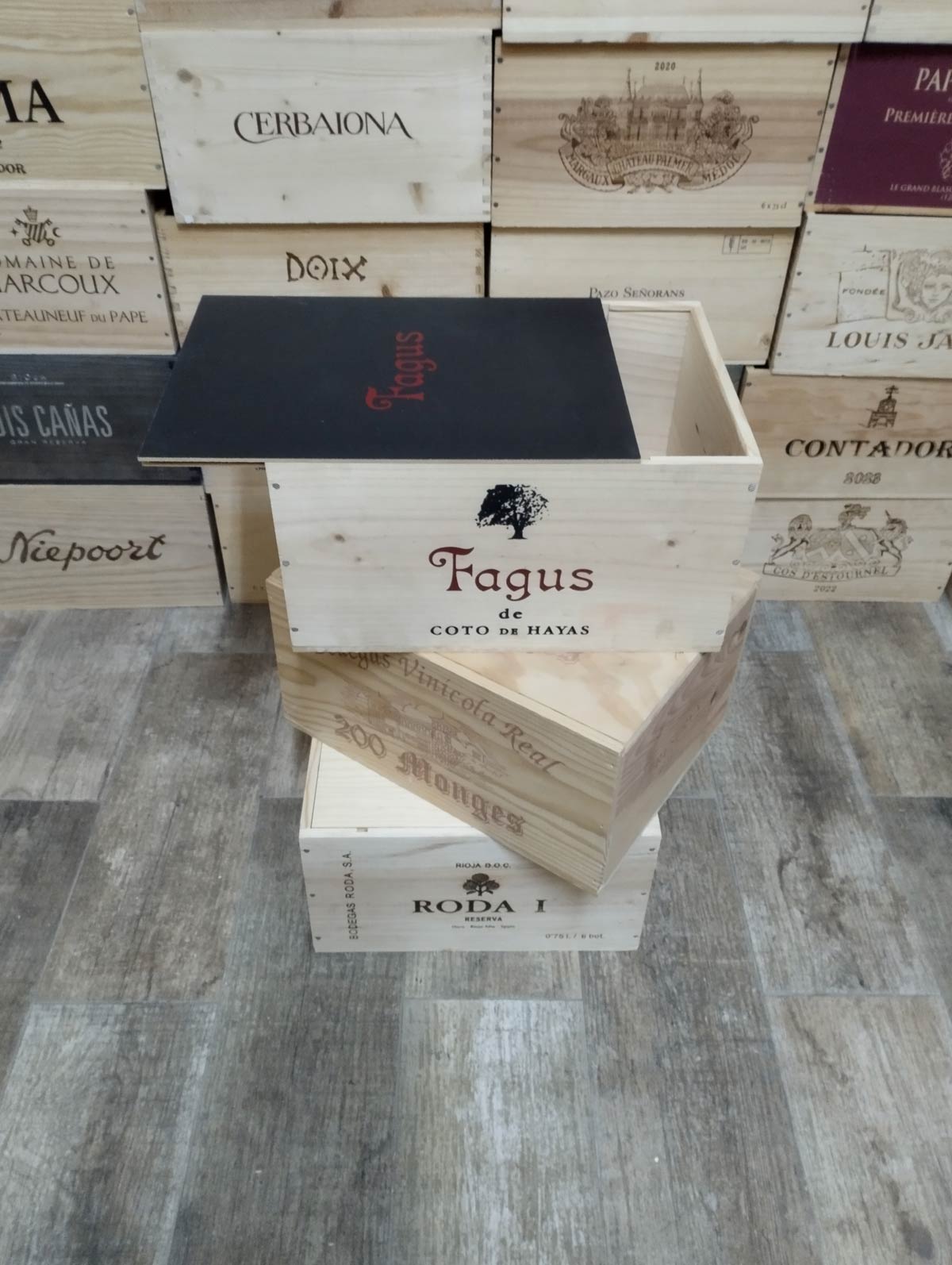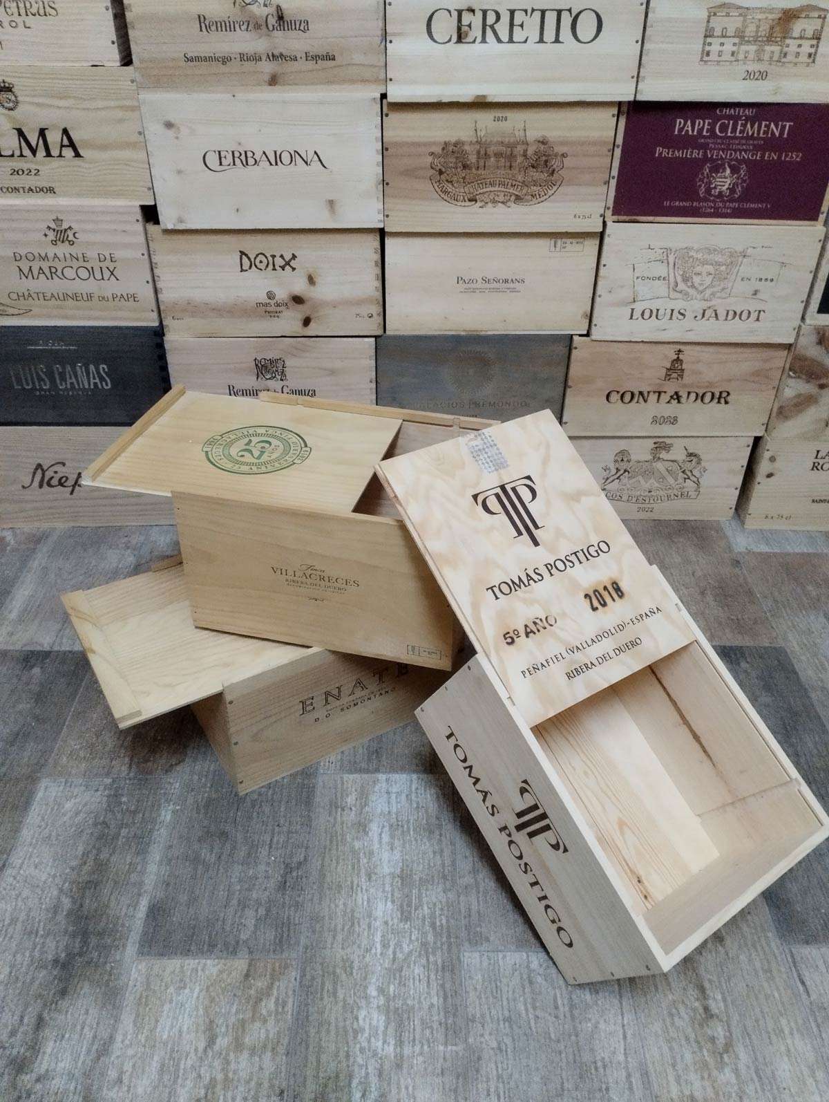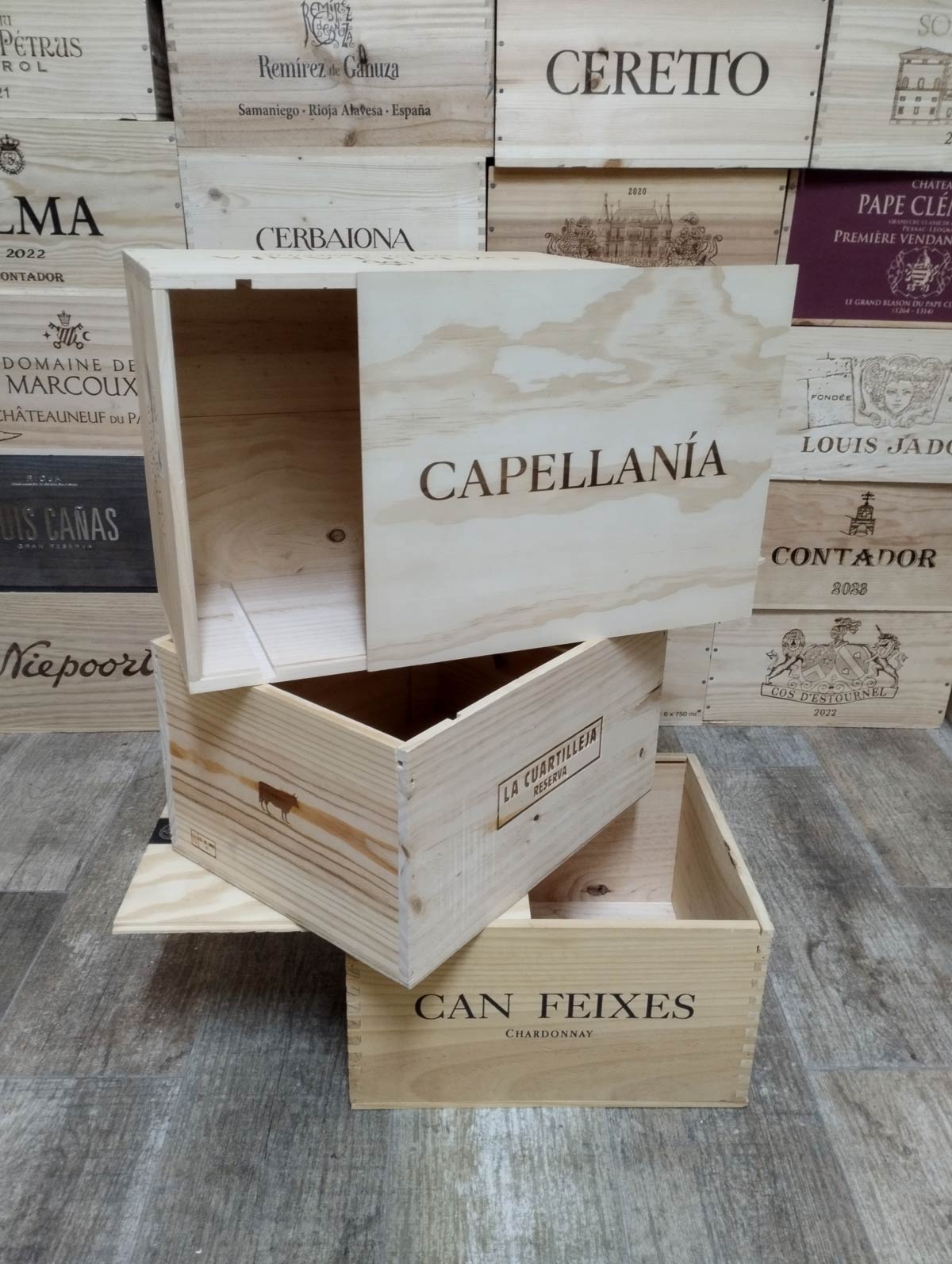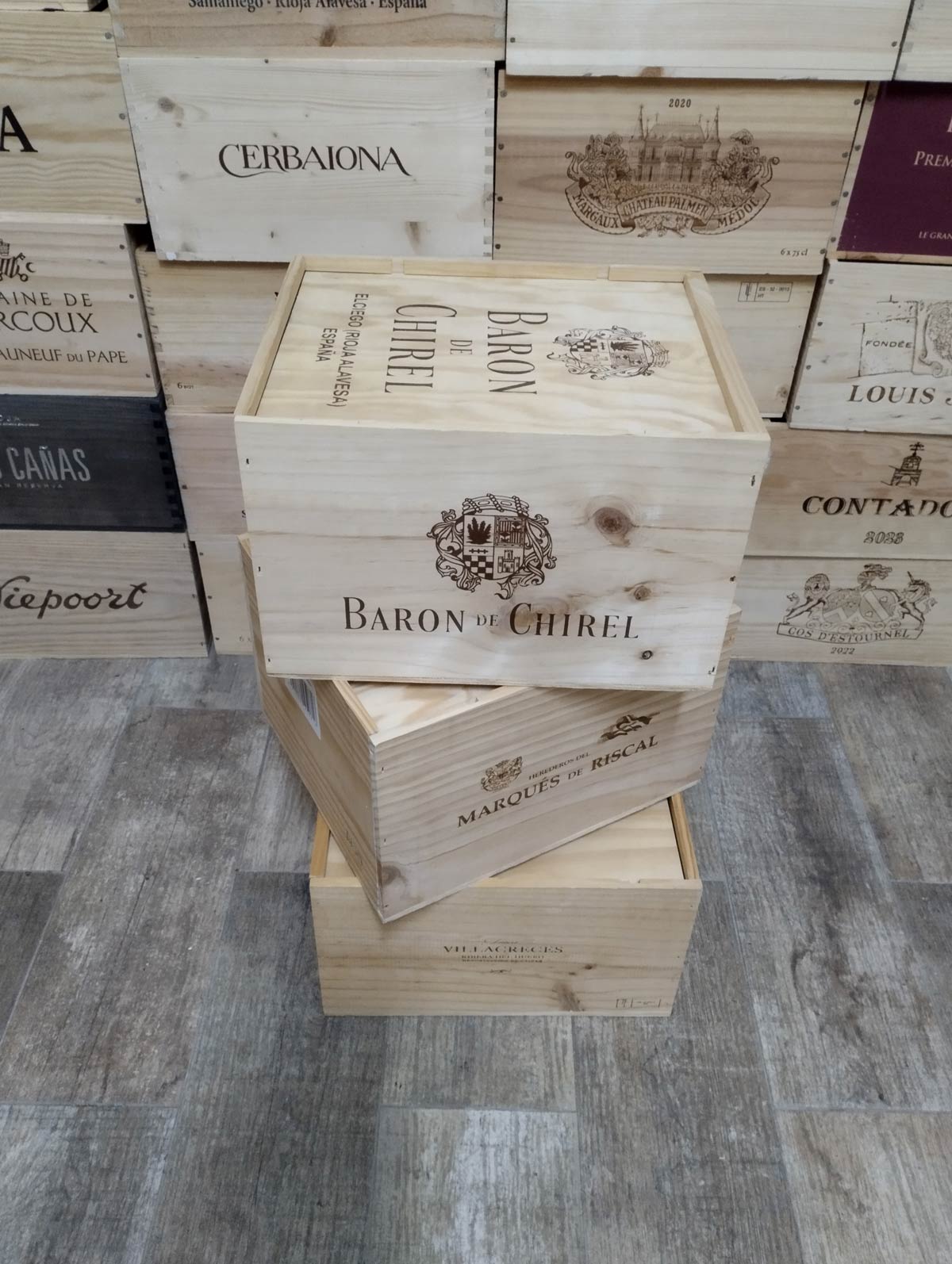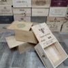 Lote de 3 cajas de vino de madera con tapa corredera ideales para almacenaje protegido, decoración de bares, bodegas y restaurantes, organización de armarios y despensas, creación de estanterías y mobiliario cálido así como photocall en bodas y eventos.